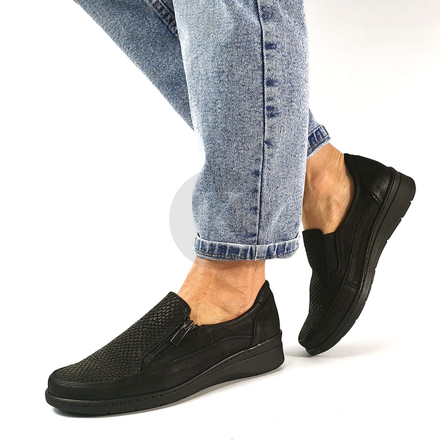 Mokasyny Damskie Nuwell 2811 w kolorze czarnym to doskonała propozycja na co dzień. Cholewka butów wykonana została z wysokiej jakości, naturalnej skóry nubukowej i lakierowanej. Producent zadbał również o detale. Buty kuszą subtelnym łączeniem oraz kontrastującym przeszyciem. Panie, które cenią komfort, docenią funkcjonalność zamka i gumki, którymi została zwieńczona cholewka. Propozycja od marki Nuwell to idealny model na wakacyjne wyjazdy – wygodny, lekki oraz ponadczasowy.