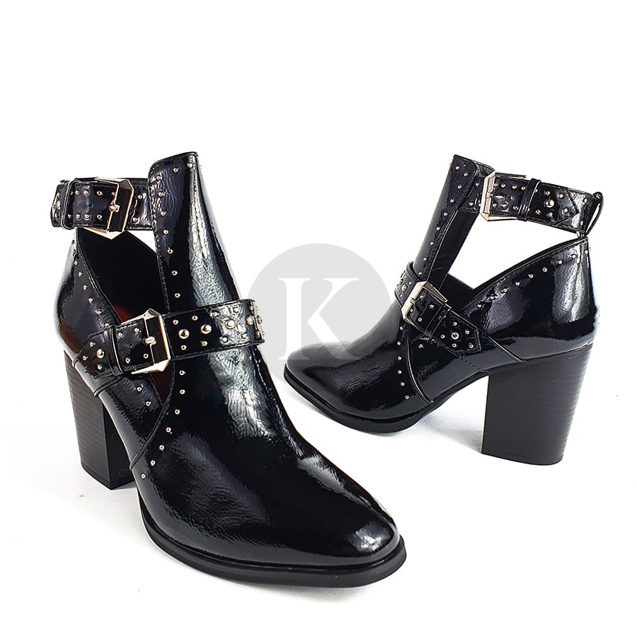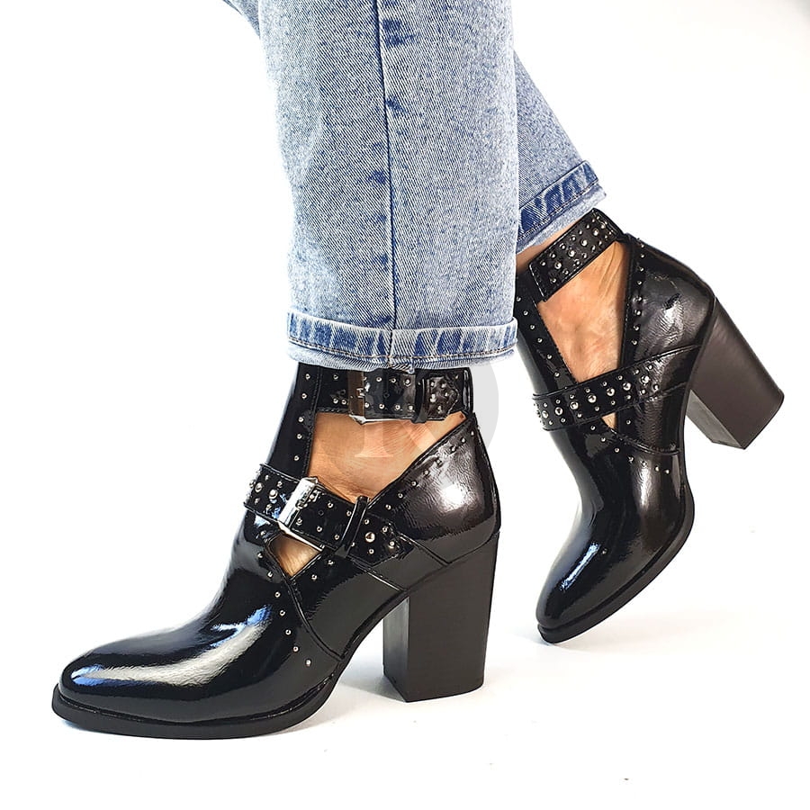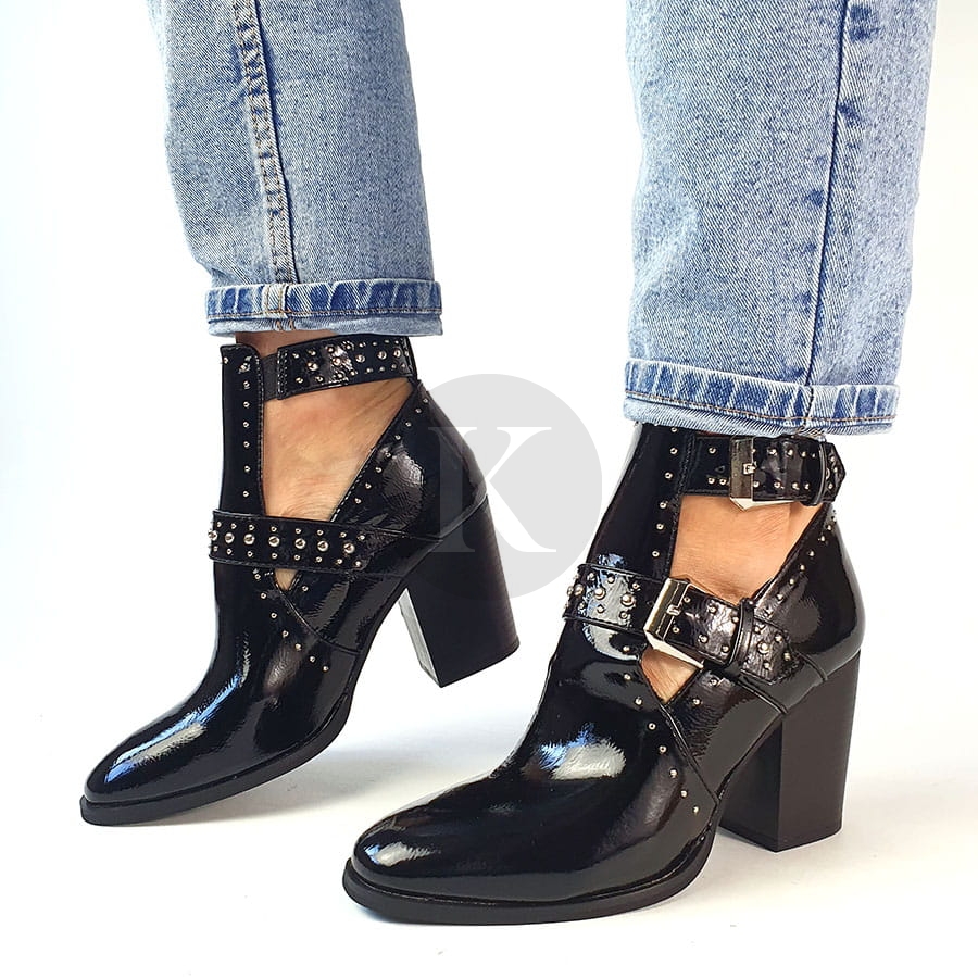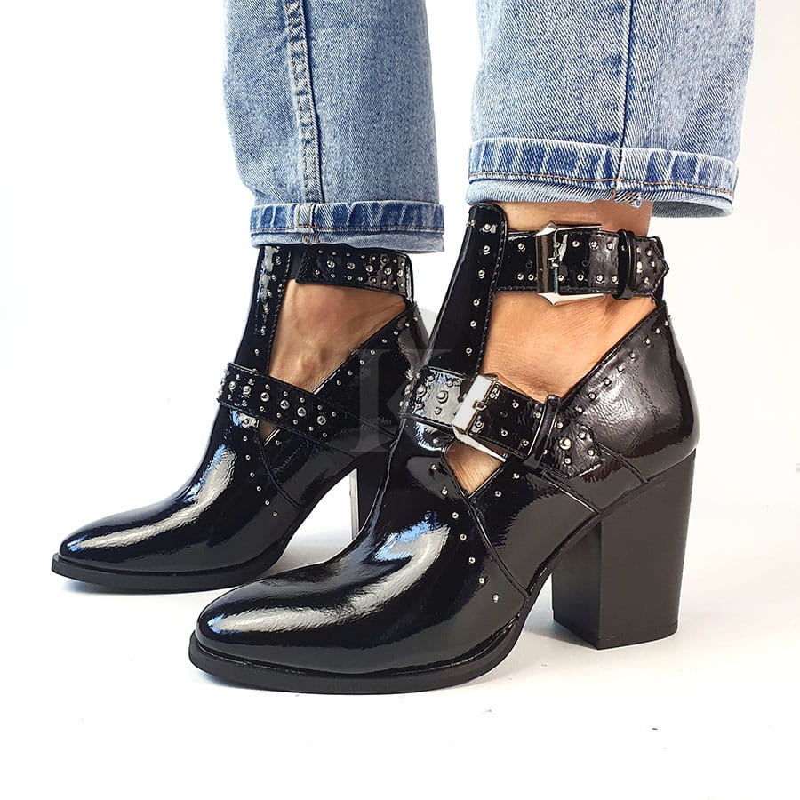 Botki Cut Out Arvi nieocieplone, wykonane z gładkiej lakierowanej ekoskóry. Osadzone ćwiekami na wysokim obcasie typu słupek. Nieregularna cholewka sięgająca do kostki posiada charakterystyczne głębokie wycięcia po bokach. Model udekorowany paskami wykończonymi klamrami oraz płaskimi nitami, które nadają im niepowtarzalnego charakteru. Zapinane na sprzączkę po zewnętrznej strony. To zjawiskowy model, który przyciąga uwagę niejednej osoby.