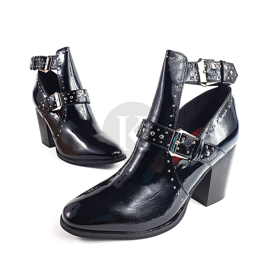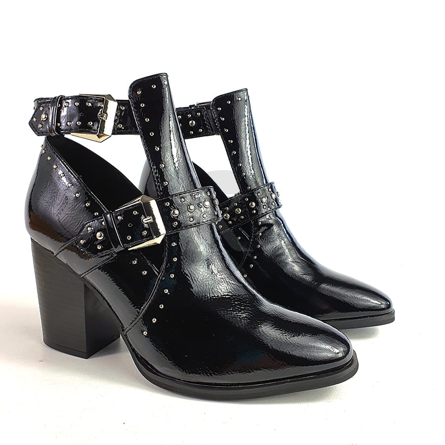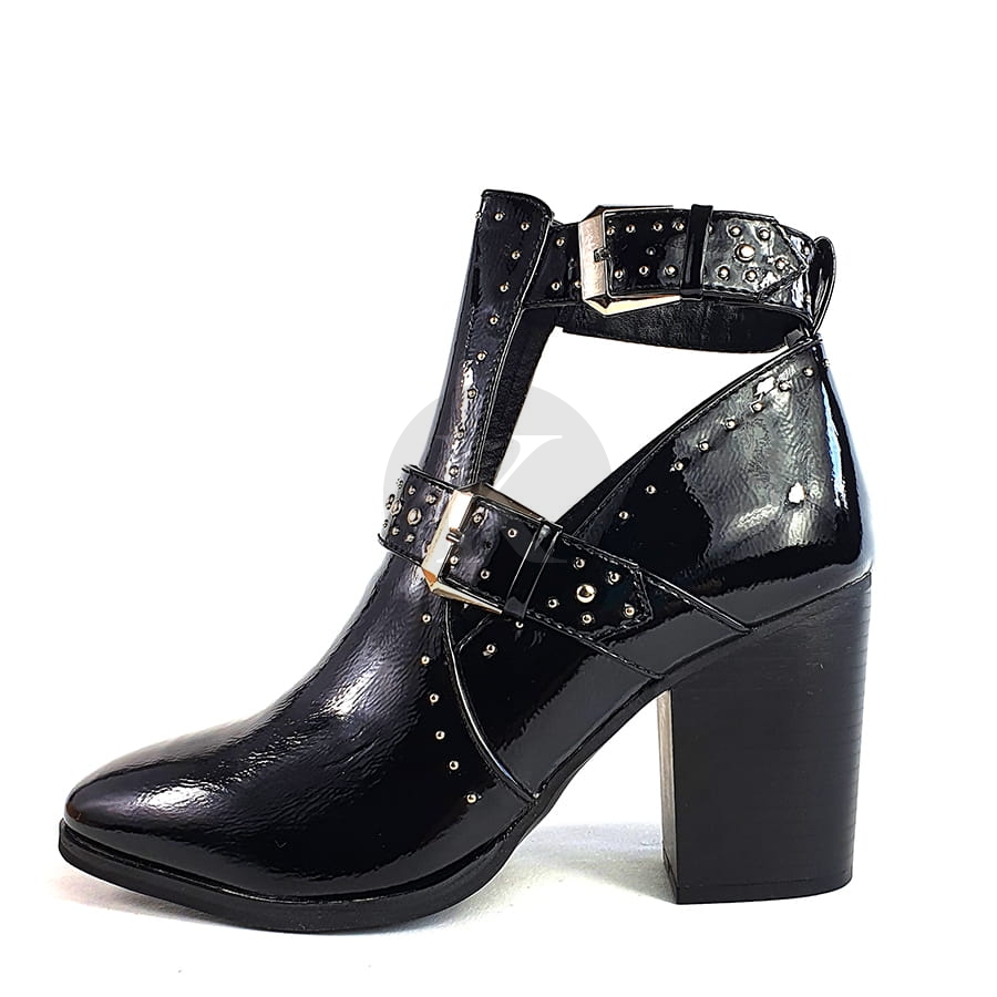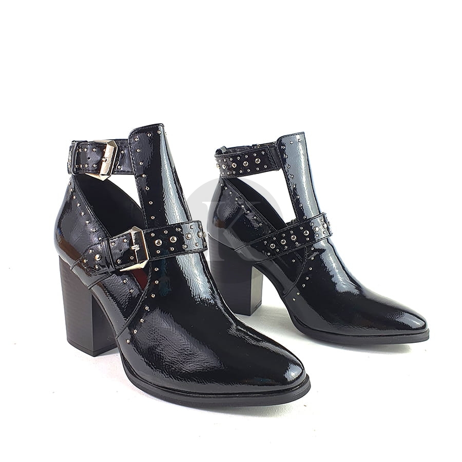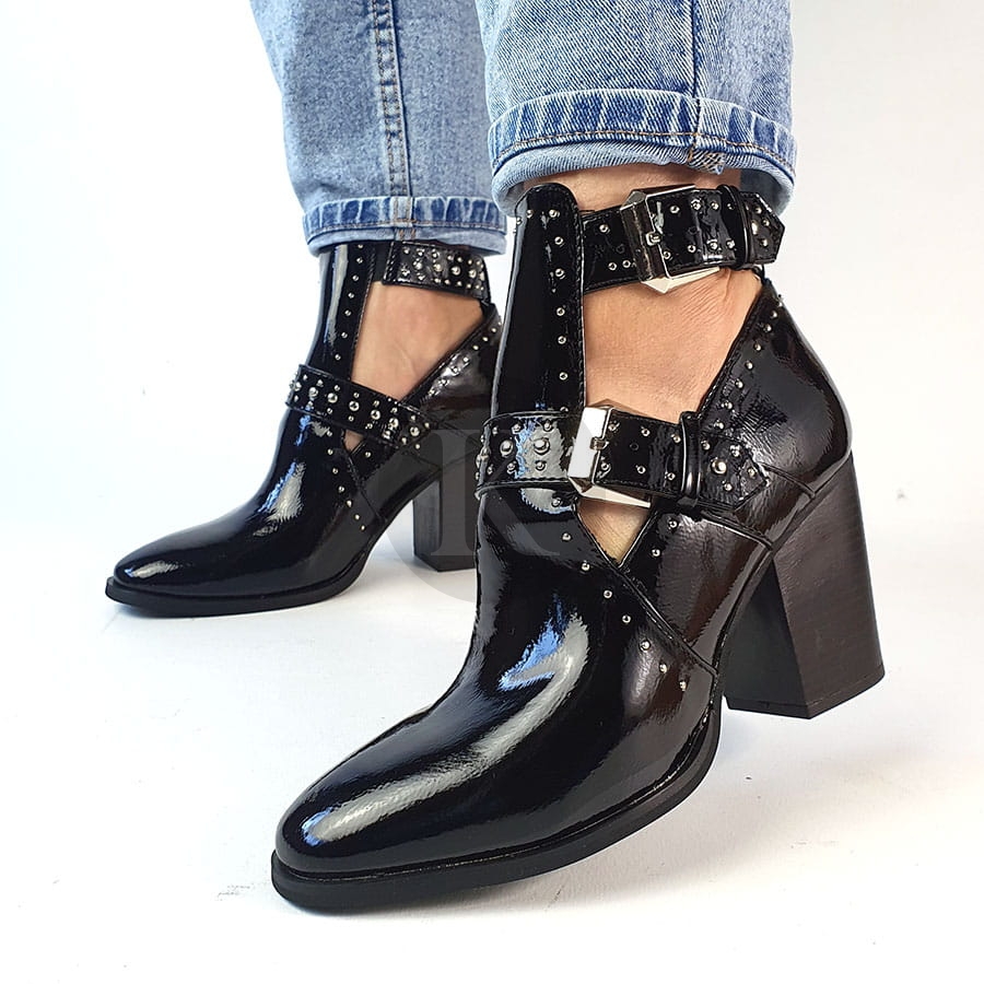 Botki Cut Out Arvi nieocieplone, wykonane z gładkiej lakierowanej ekoskóry. Osadzone ćwiekami na wysokim obcasie typu słupek. Nieregularna cholewka sięgająca do kostki posiada charakterystyczne głębokie wycięcia po bokach. Model udekorowany paskami wykończonymi klamrami oraz płaskimi nitami, które nadają im niepowtarzalnego charakteru. Zapinane na sprzączkę po zewnętrznej strony. To zjawiskowy model, który przyciąga uwagę niejednej osoby.