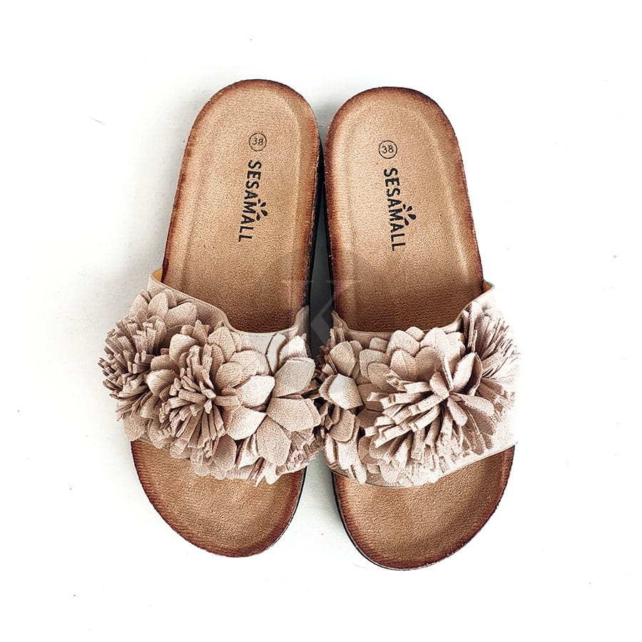 Bżowe Klapki z Profilowaną Podeszwą i Ozdobnymi Kwiatkami Lustilla