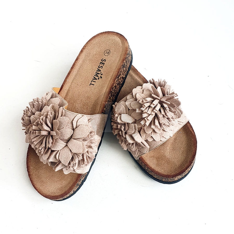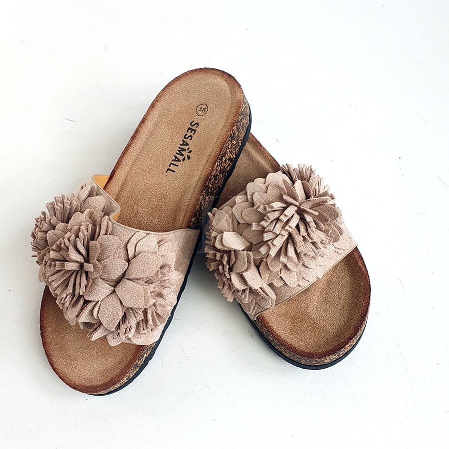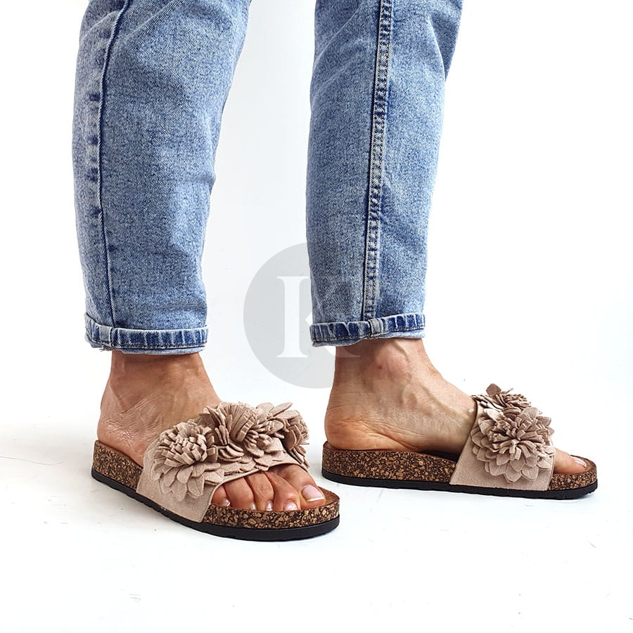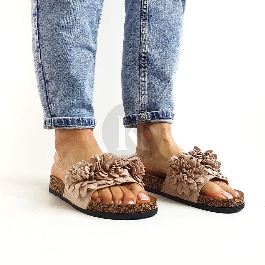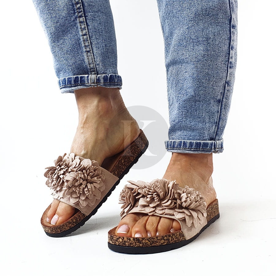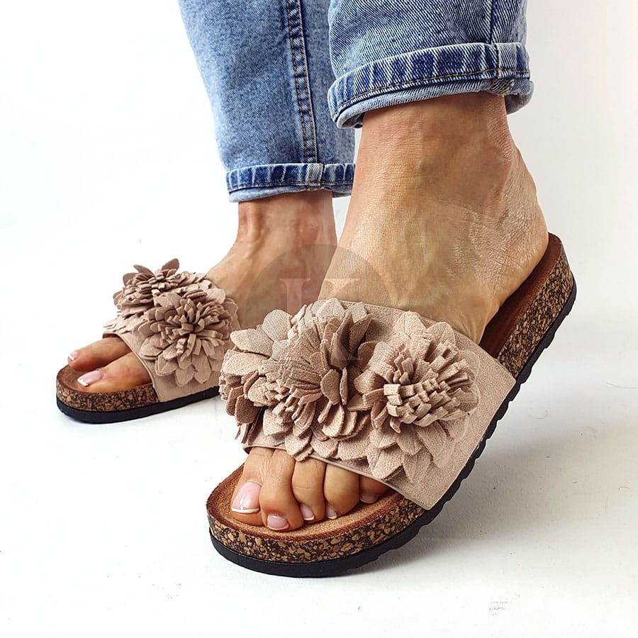 Klapki Lustilla na płaskiej podeszwie typu korek to połączenie komfortu i stylu, idealne na letnie dni. Wykonane z ekozamszu. Ozdobione dużym, dekoracyjnym kwiatem z przodu. Wsuwane z odkrytym, okrągłym noskiem. Dodatkowo wyprofilowana wkładka z materiału imitującego zamsz zapewniająca komfort na każdym kroku. Te klapki są nie tylko modnym dodatkiem, ale także praktycznym i wygodnym obuwiem, które będzie towarzyszyć Ci przez wiele letnich sezonów, sprawiając, że każdy krok będzie lekki i pełen przyjemności.
