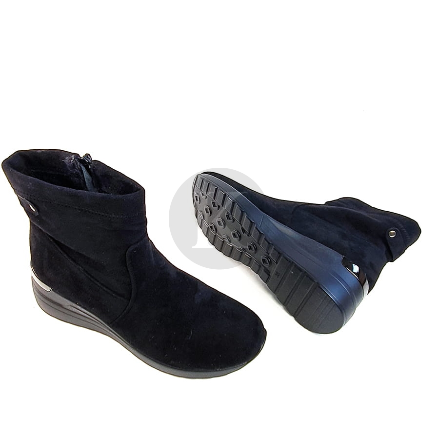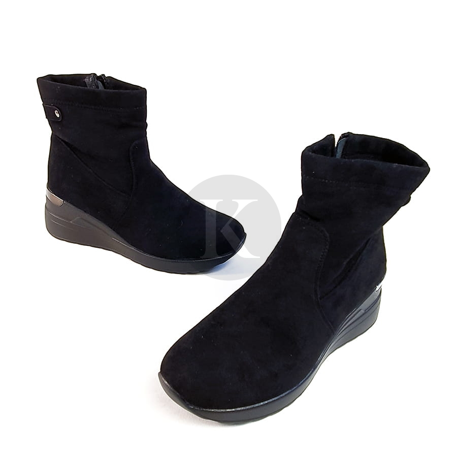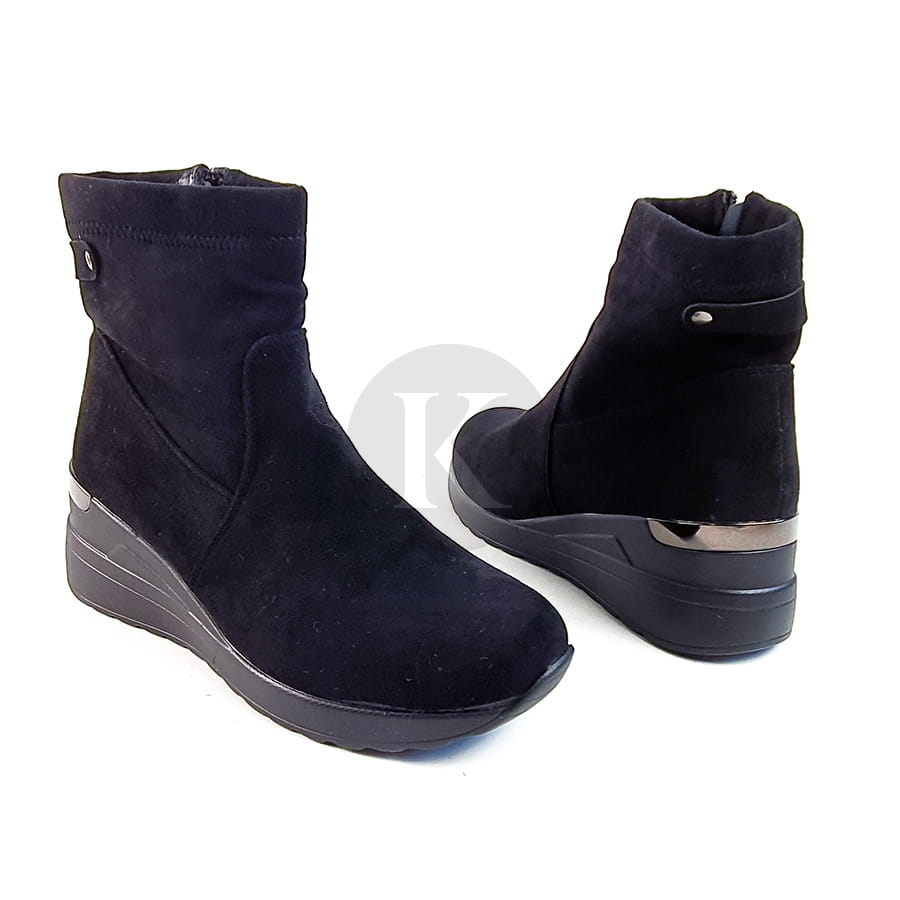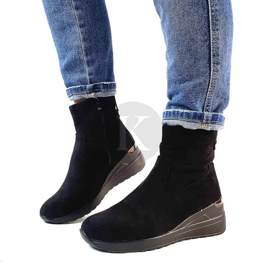 Botki sneakersy zamszowe na koturnie Leticia zapinane na zamek błyskawiczny, noski okrągłe. Na niewysokim koturnie, obcas w tylnej części zdobiony metaliczną aplikacją. Botki z elastyczną cholewką na koturnie to idealny wybór do casualowych stylizacji.