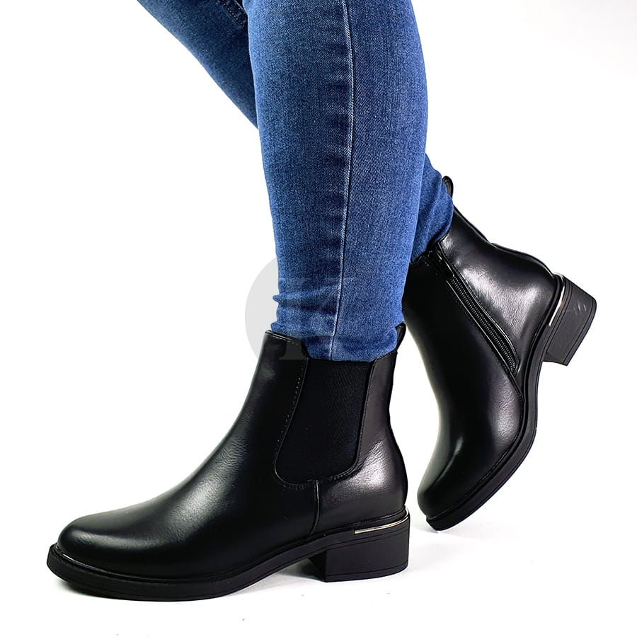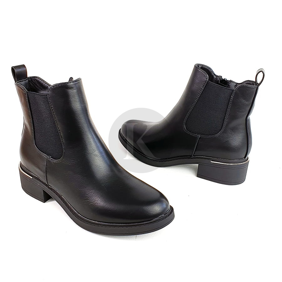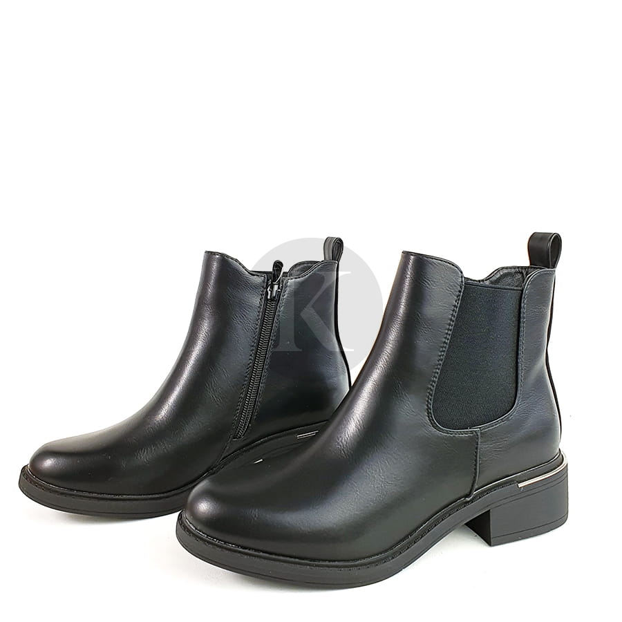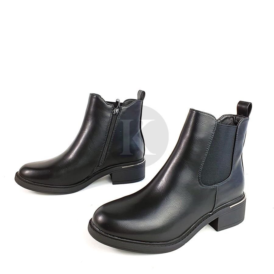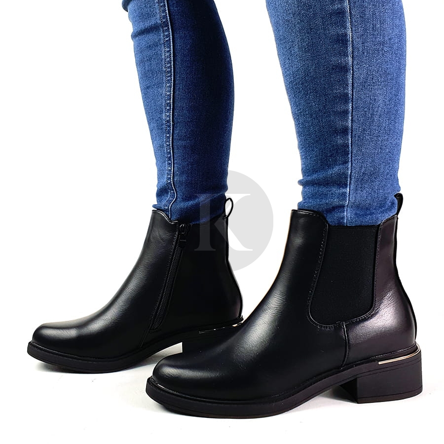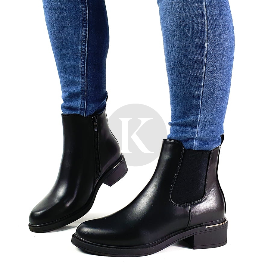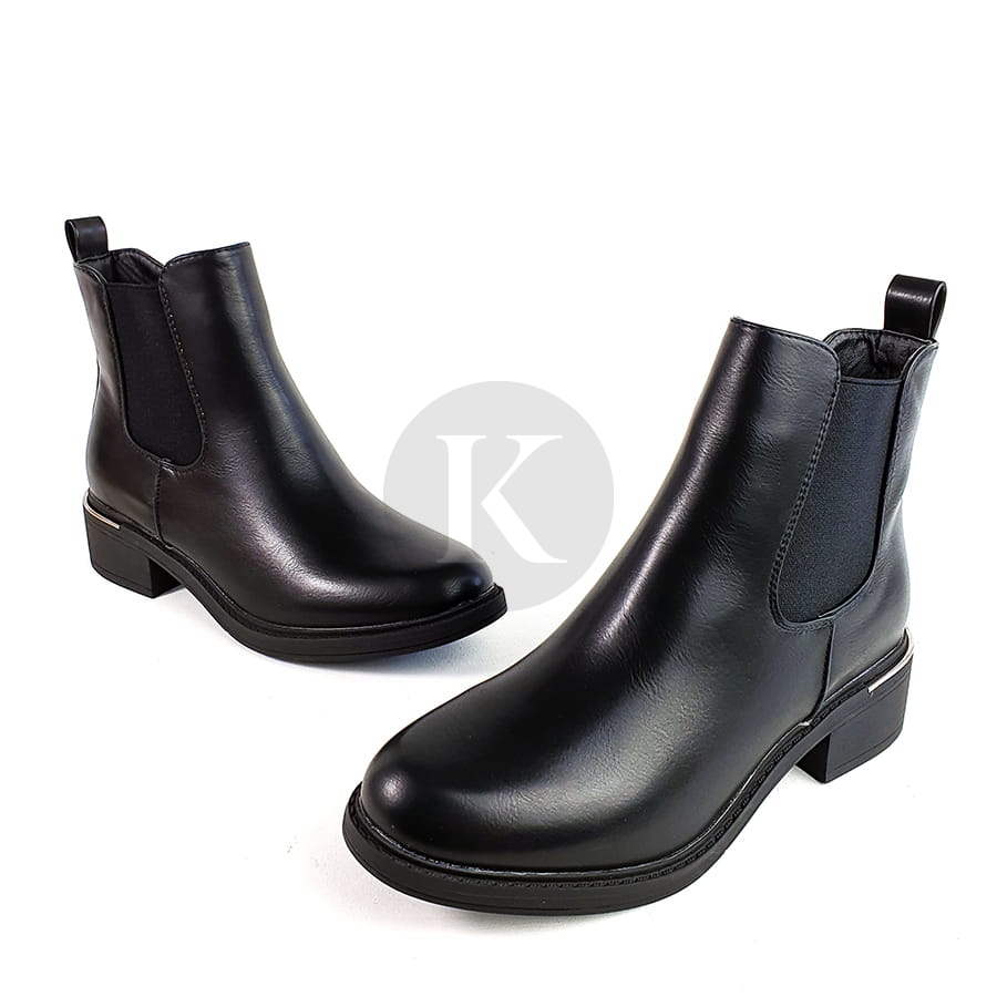 Botki Stella o fasonie sztybletów, z cholewką za kostkę udekorowaną wstawkami z elastycznych ściągaczy po bokach. Zapinane na zamek z migdałowym noskiem. Na płaskim obcasie z srebrną wstawką. Wykonane z ekoskóry. Ocieplone futerkiem. Botki Stella to minimalistyczny, prosty model, który doda klasy każdemu outfitowi