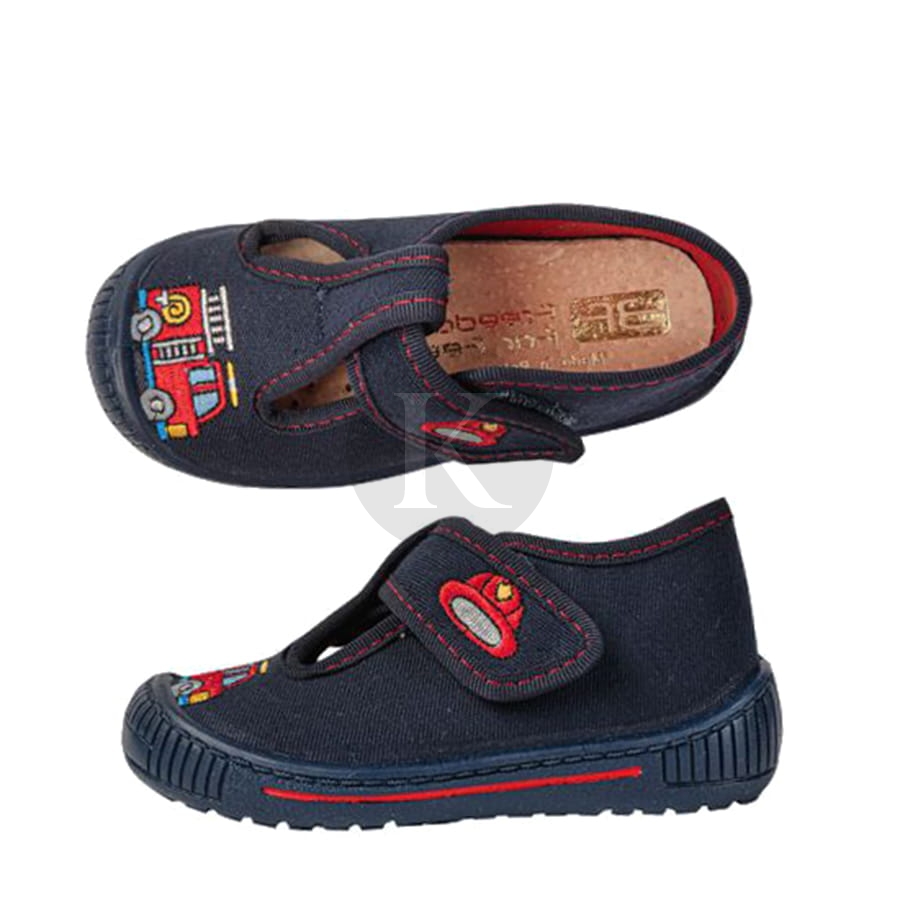 Kapcie dziecięce wykonane z przewiewnego płótna w kolorze granatowym z wozem strażackim. Tkaniny zastosowane do produkcji obuwia 3F umożliwiają oddychanie stóp a nowoczesna technologia sklejania gwarantuje przepuszczanie powietrza i wentylację wewnątrz obuwia. Wszystkie kapcie firmy 3F posiadają lekko profilowane , profilaktyczne , skórzane wkładki. Buciki posiadają antypoślizgowy elastyczny spód łatwo zginający się na linii stawów śródstopnopaliczkowych. Taki spód nie powoduje zaburzeń w naturalnym sposobie poruszania się dziecka. Zapiętek jest dodatkowo usztywniony - to stabilizuje ruchy i ułożenie stopy. Czubki bucików są szerokie i wysokie stosownie do promieniście ułożonych palców.