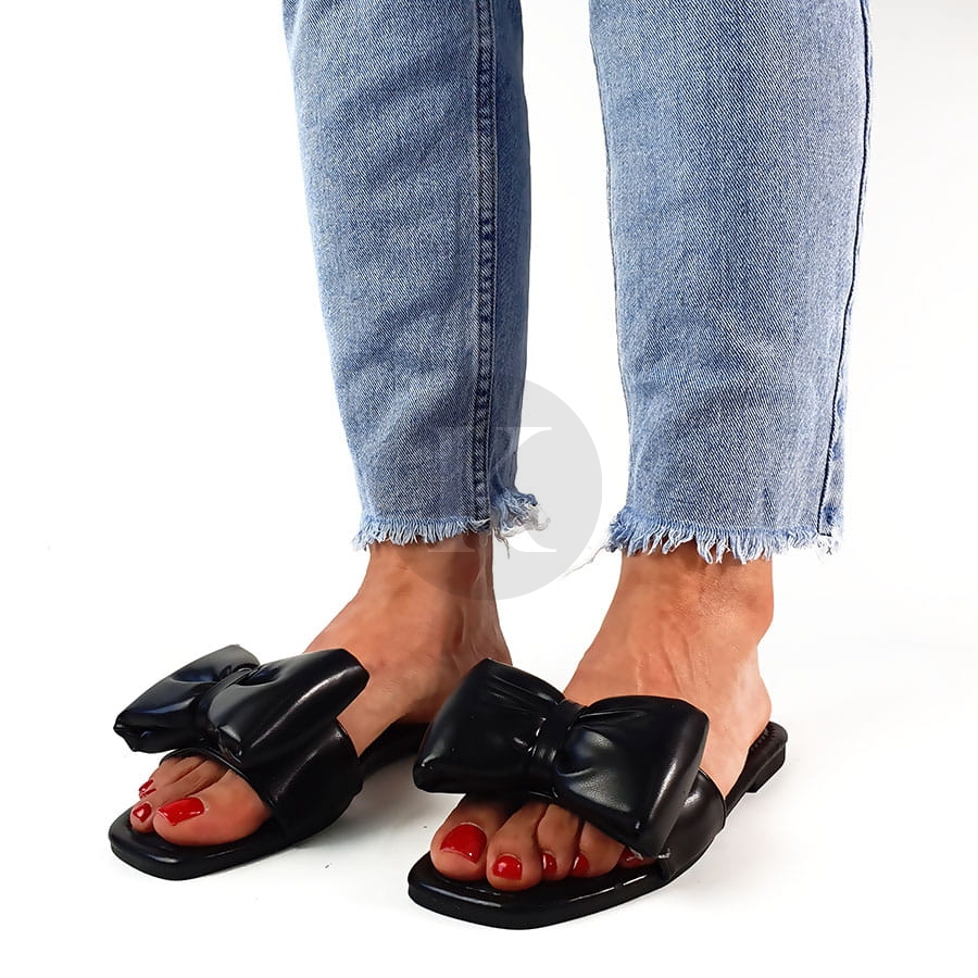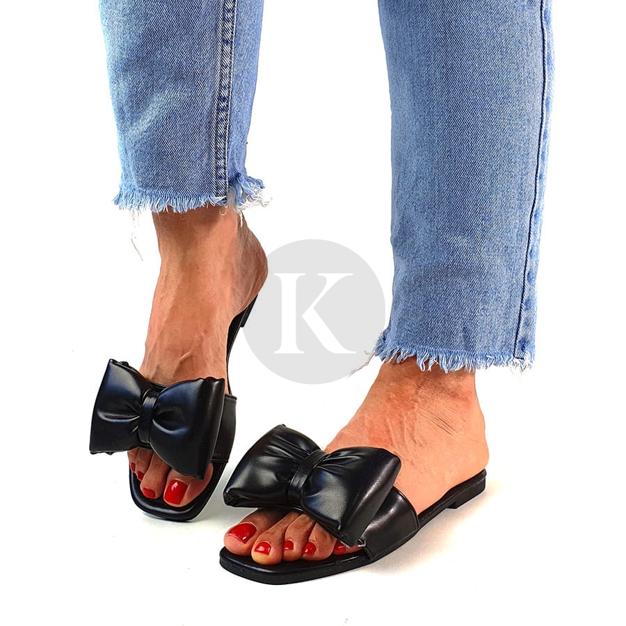 Klapki Avanisa o uroczym wyglądzie. Z pozoru minimalistyczny fason ozdobiony dużą kokardą z przodu z efektem puff. Wsuwane z odkrytym kwadratowym noskiem. Osadzone na płaskie podeszwie, która jest doceniana przez wiele kobiet. Stopę podtrzymuję pasek. W całości wykonane ze skóry ekologicznej. Utrzymane w jednolitej kolorystyce, dzięki temu dopasujesz je do wielu outfitów. Wygodne klapki, które zapewnią Ci niebywały komfort podczas użytkowania. Idealnie będą współgrać ze zwiewną sukienką.