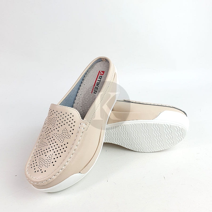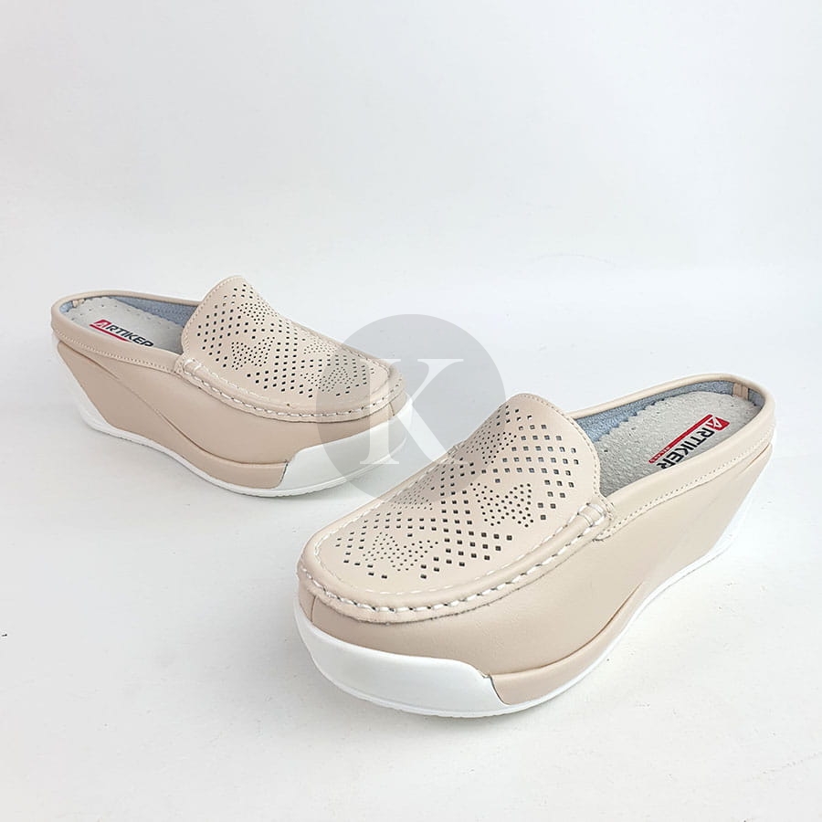 Komfortowe i lekkie klapki damskie znanej marki Artiker. Cholewka wykonana jest z wysokiej jakości i miękkości skóry naturalnej w kolorze beżowym. Wygodę zapewnia miękka, skórzana wkładka i wyściółka. Modna podeszwa jest lekka i trwała. Uroku dodają srebrne wstawki na cholewce i na koturnie. To świetna propozycja do wiosny do jesieni. Uniwersalne komfortowe klapki sprawdzą się w codziennym użytkowaniu.
